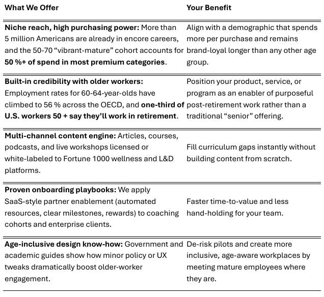 Older professionals are extending their careers, launching encore ventures, and controlling more than half of all category spending—yet most corporate programs, content libraries, and partner ecosystems still overlook them. Our partnerships translate this untapped momentum into measurable ROI for you, while advancing our mission to help every seasoned professional design a purpose‑filled “next chapter.”